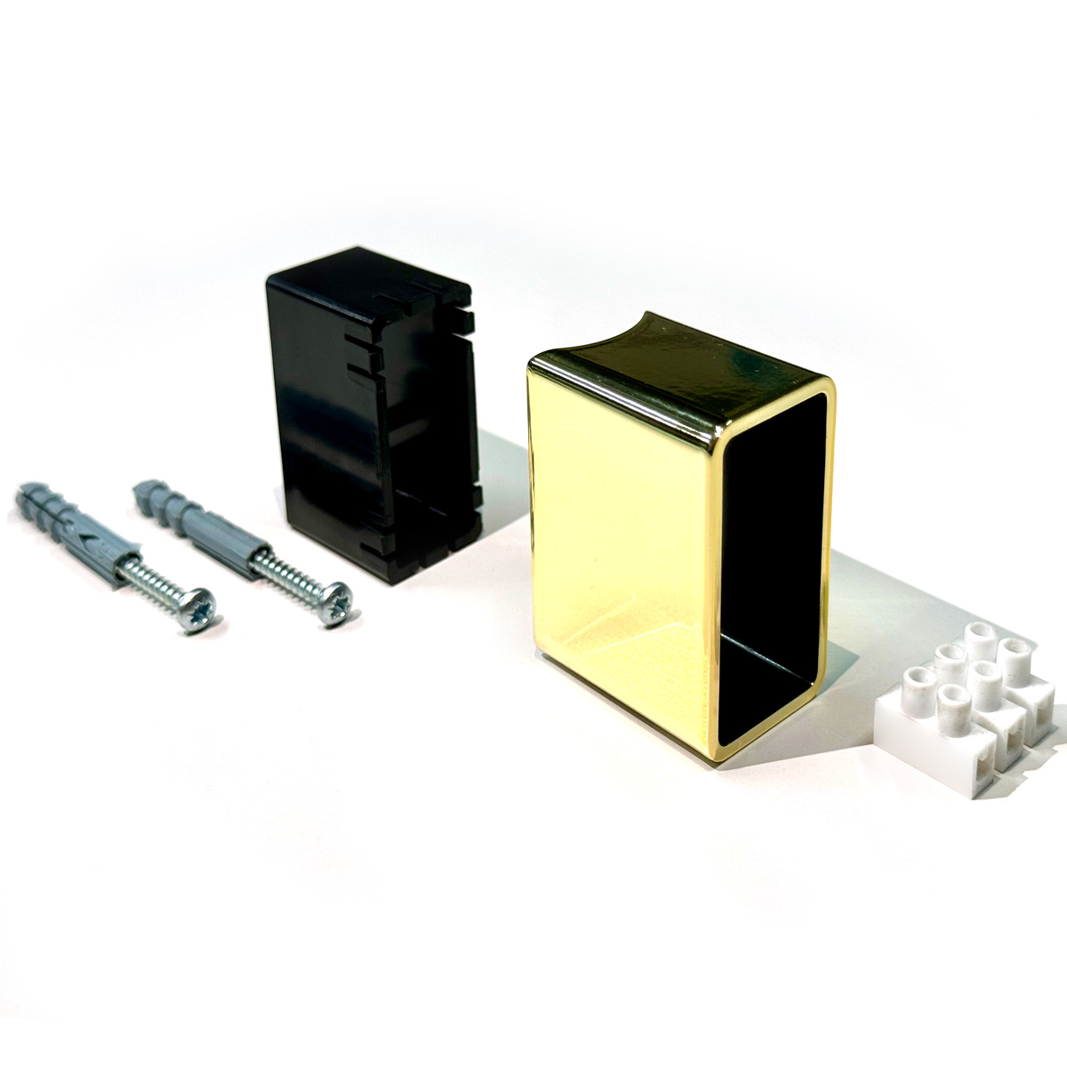 Комплект прихованого монтажу підходить для золотих електричних рушникосушок з терморегулятором на стійці. Він підвищить естетичність рушникосушки, надавши можливість заховати електричну проводку. Ідеально підійде для рушникосушок золотого кольору, адже відтінок модуля підібраний до тону наших рушникосушок.