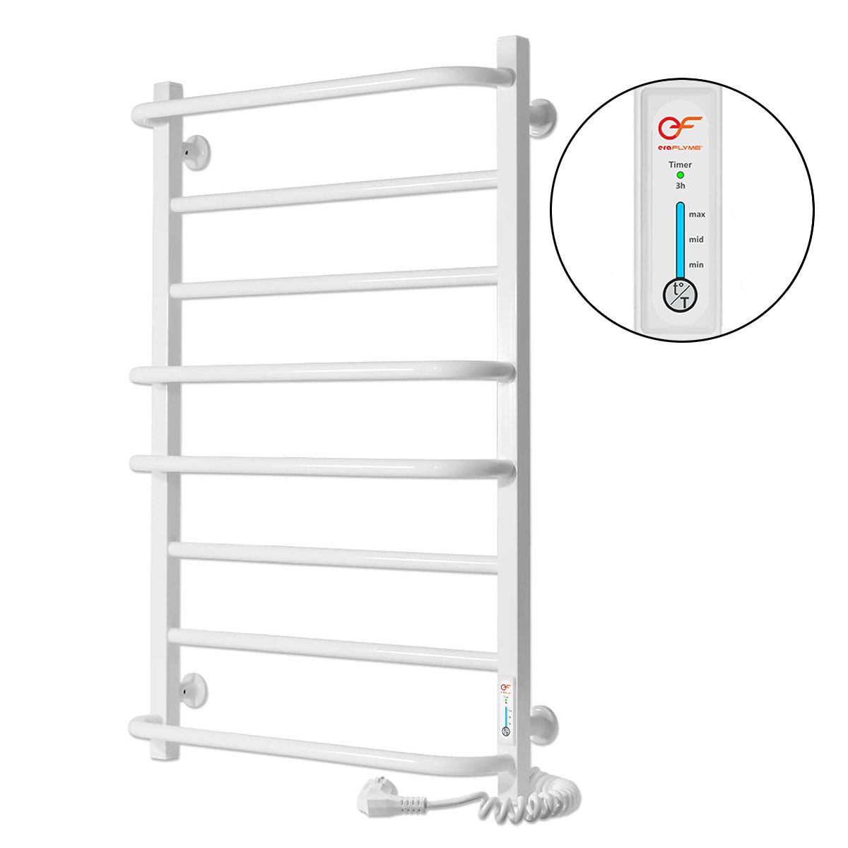 Рушникосушка білого кольору є універсальним приладом для сушки різних речей в будь-якому приміщенні, такому як ванна кімната, кухня або пральня. Вона виготовлена з високоякісної сталі та має оригінальне біле покриття. Рушникосушка має вбудований терморегулятор з таймером, що дозволяє контролювати температуру під час роботи приладу. Рушникосушка має 8 поперечних перемичок, висоту 810 мм, ширину 525 мм та глибину 142 мм. Сторона підключення до мережі - ліва.