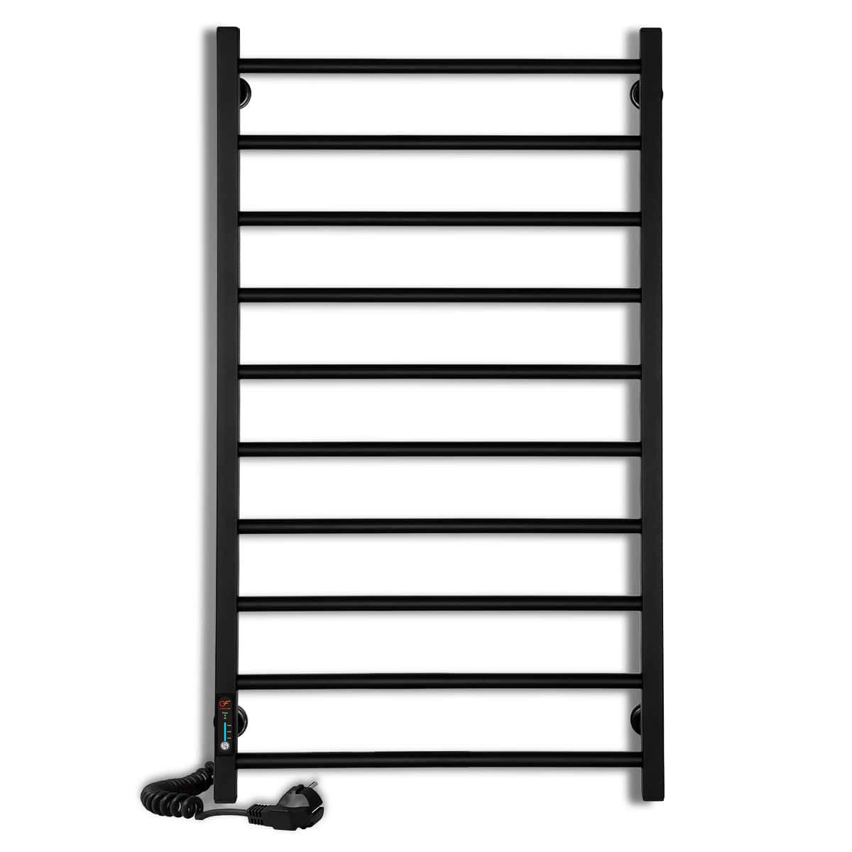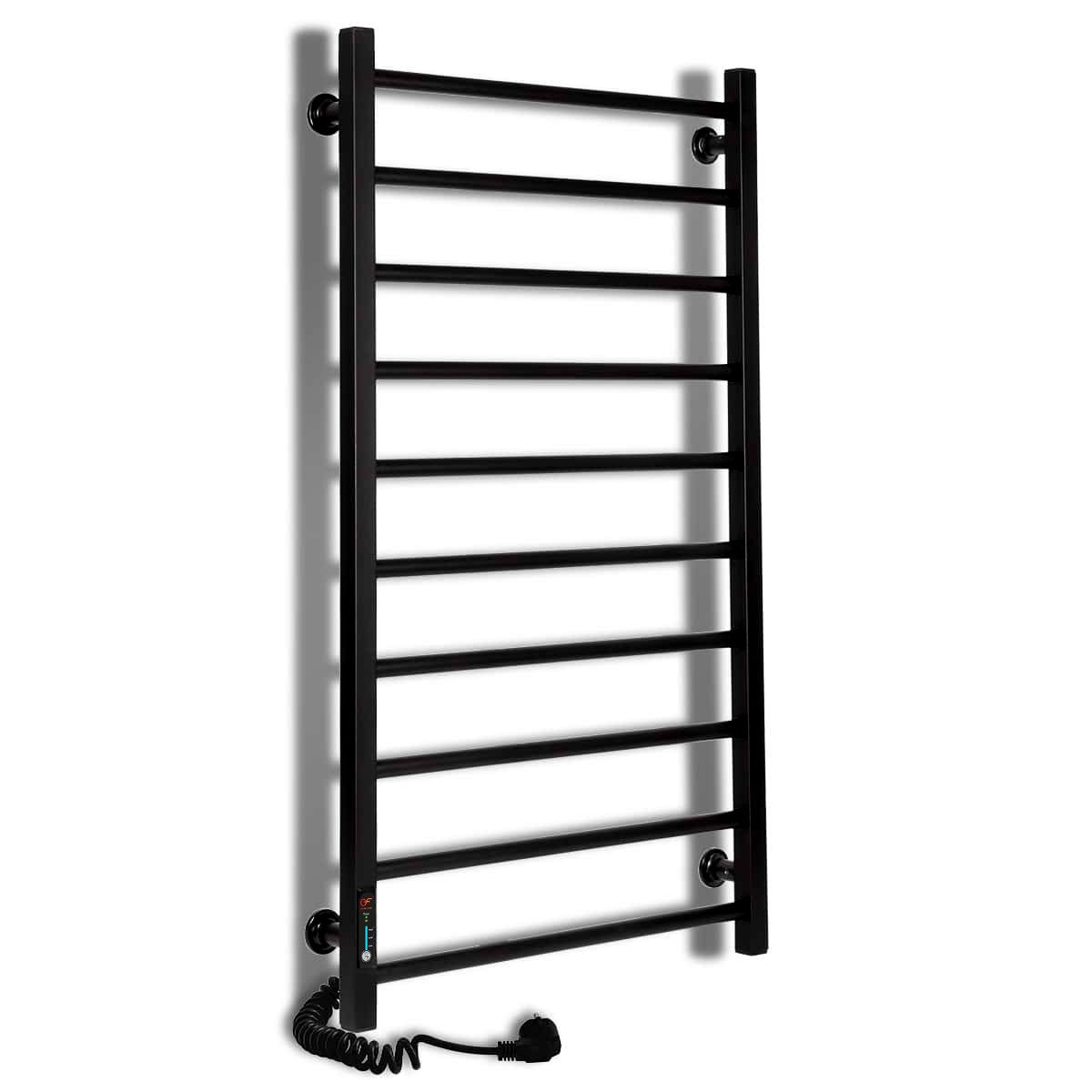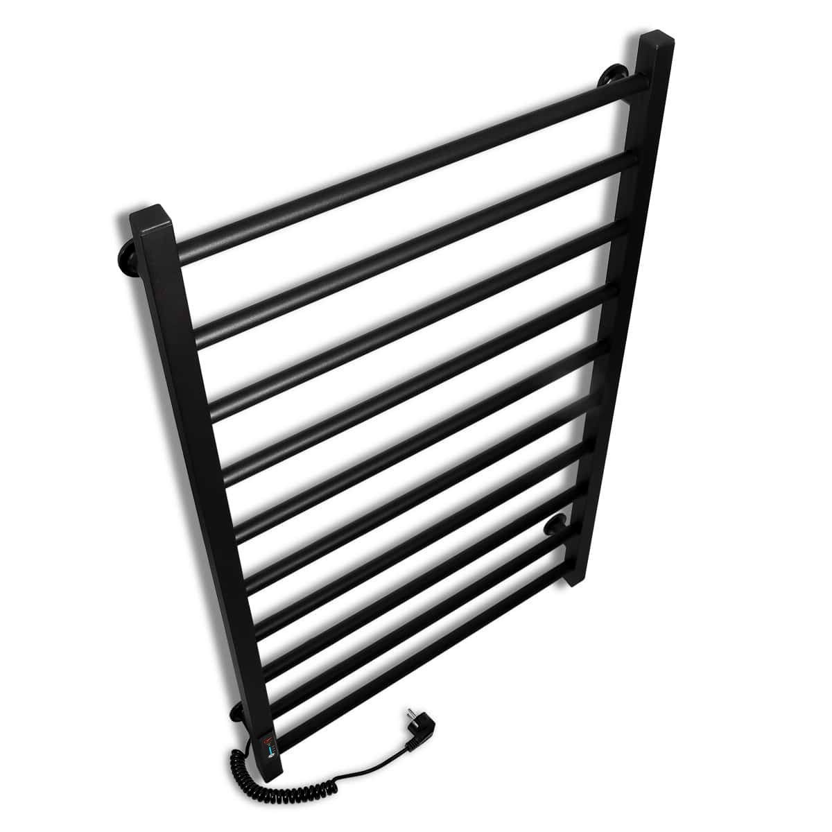 Чорна рушникосушка з матовою поверхнею може бути встановлена в будь-якому приміщенні, де необхідно сушити речі. Це може бути ванна кімната, кухня або пральня. Виготовлена з високоякісної сталі, рушникосушка має вбудований мікропроцесорний терморегулятор з таймером, який дозволяє регулювати температуру поверхні приладу. Чорна рушникосушка має 10 поперечних перекладин і розміри: висота - 909 мм; ширина - 525 мм; глибина - 65 мм.