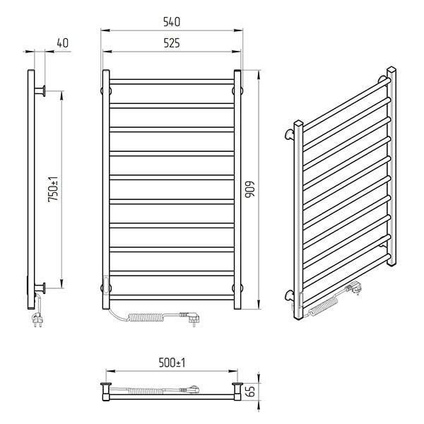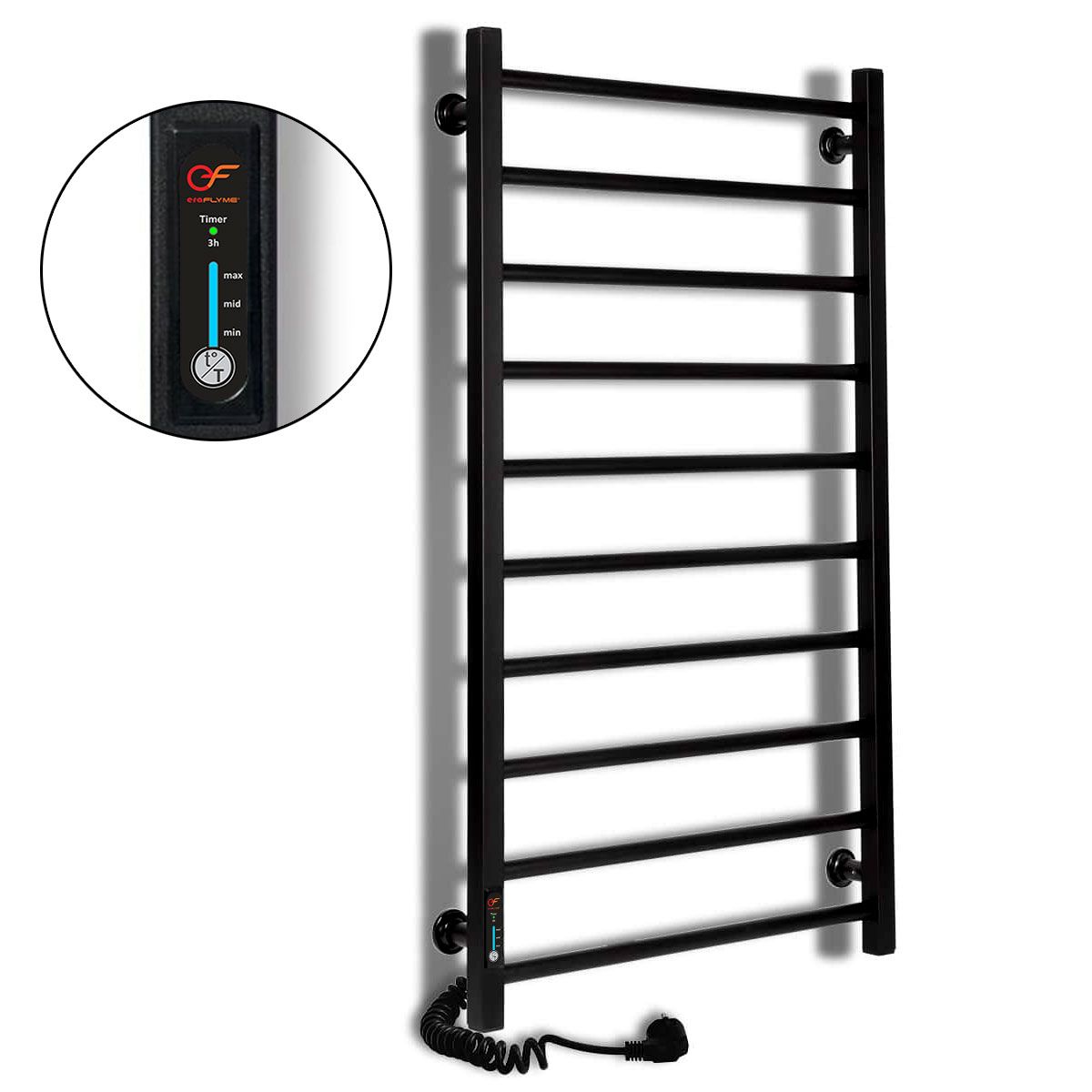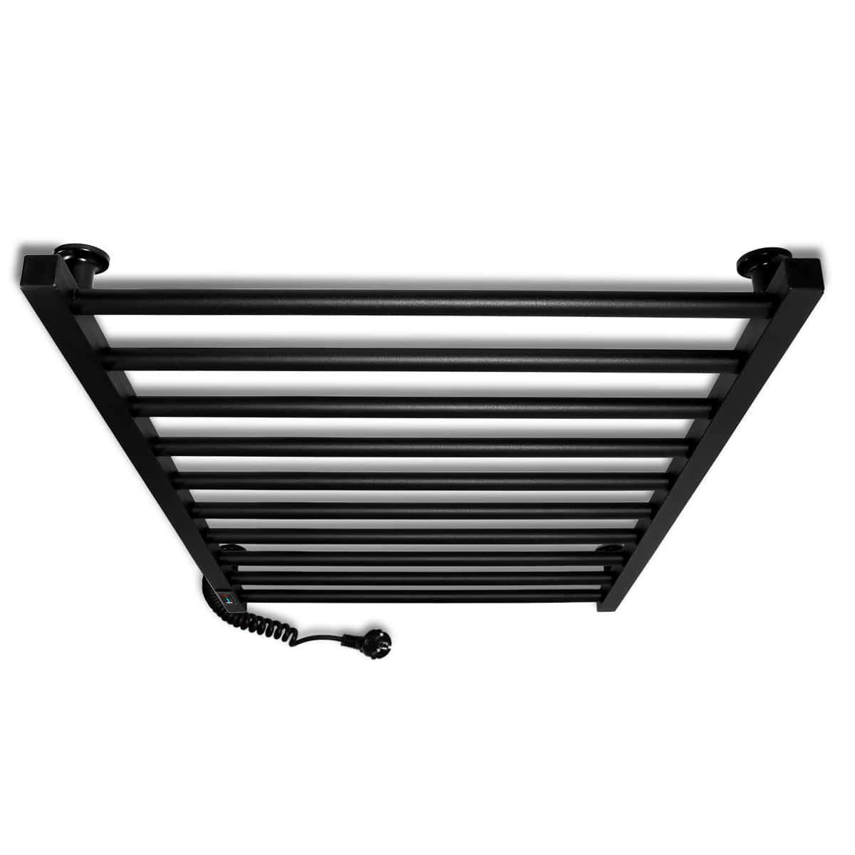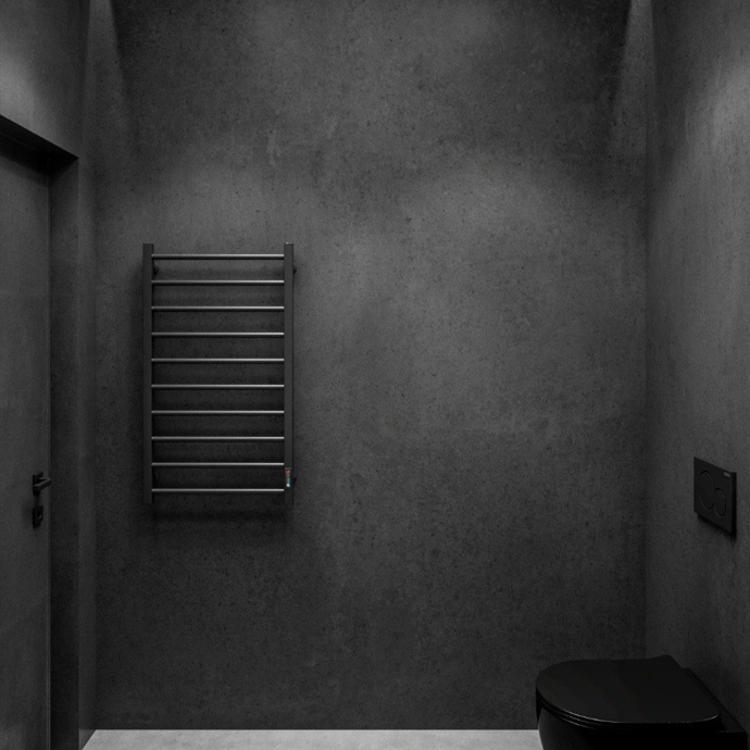 Чорна рушникосушка з матовою поверхнею може бути встановлена в будь-якому приміщенні, де необхідно сушити речі. Це може бути ванна кімната, кухня або пральня. Виготовлена з високоякісної сталі, рушникосушка має вбудований мікропроцесорний терморегулятор з таймером, який дозволяє регулювати температуру поверхні приладу. Чорна рушникосушка має 10 поперечних перекладин і розміри: висота - 909 мм; ширина - 525 мм; глибина - 65 мм.