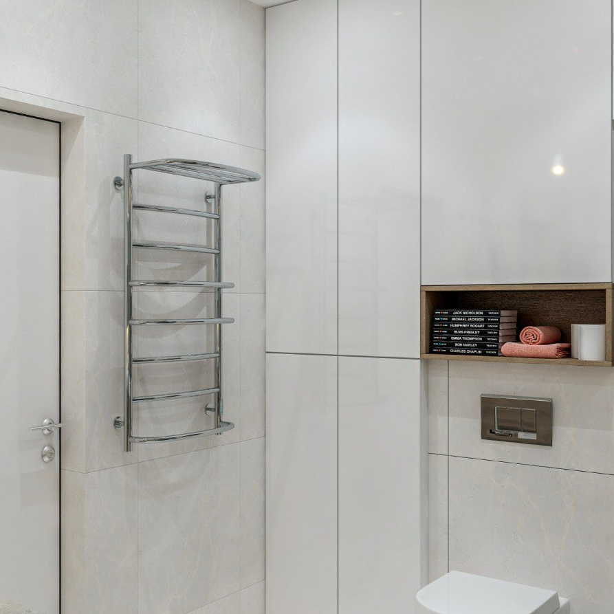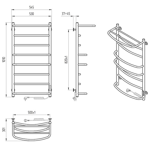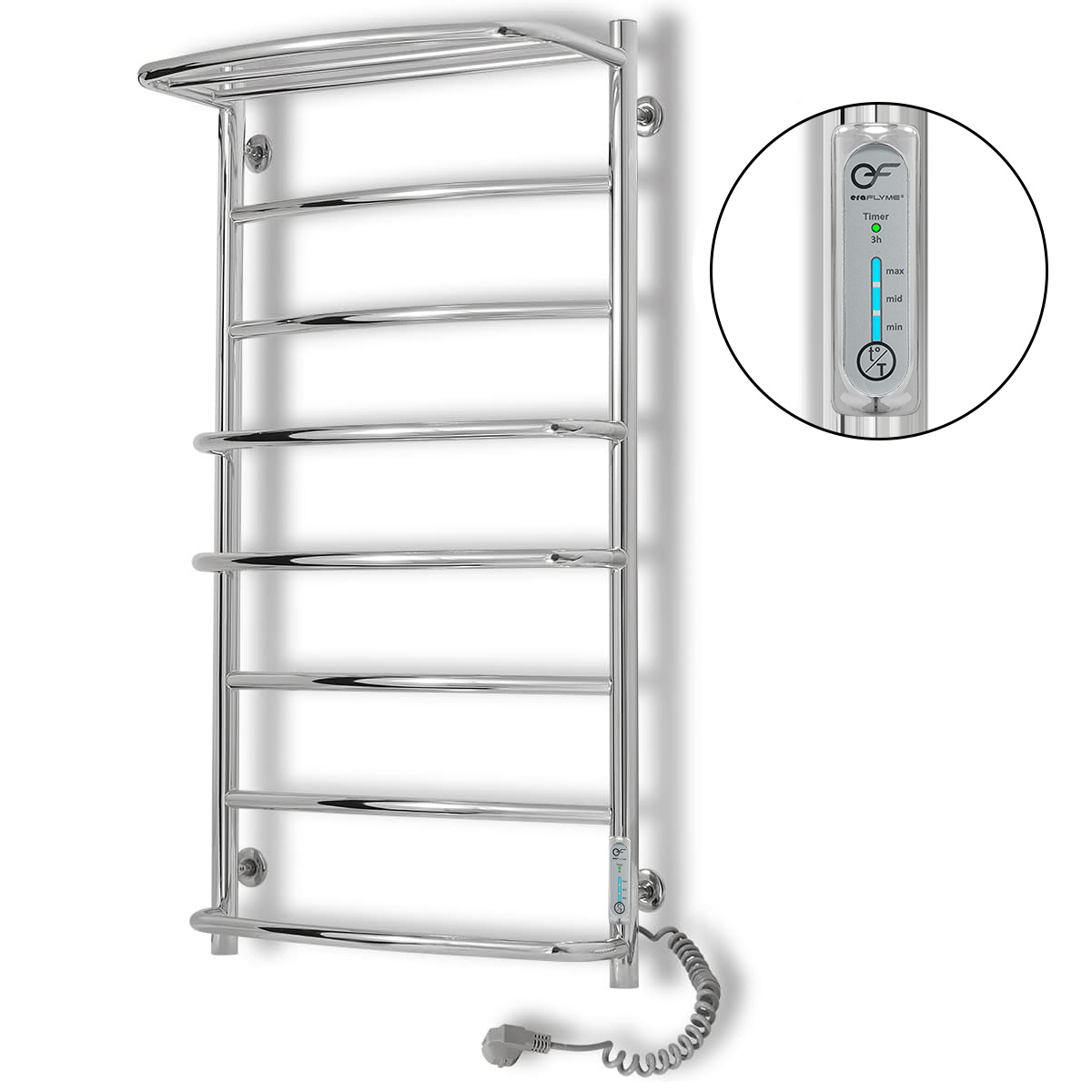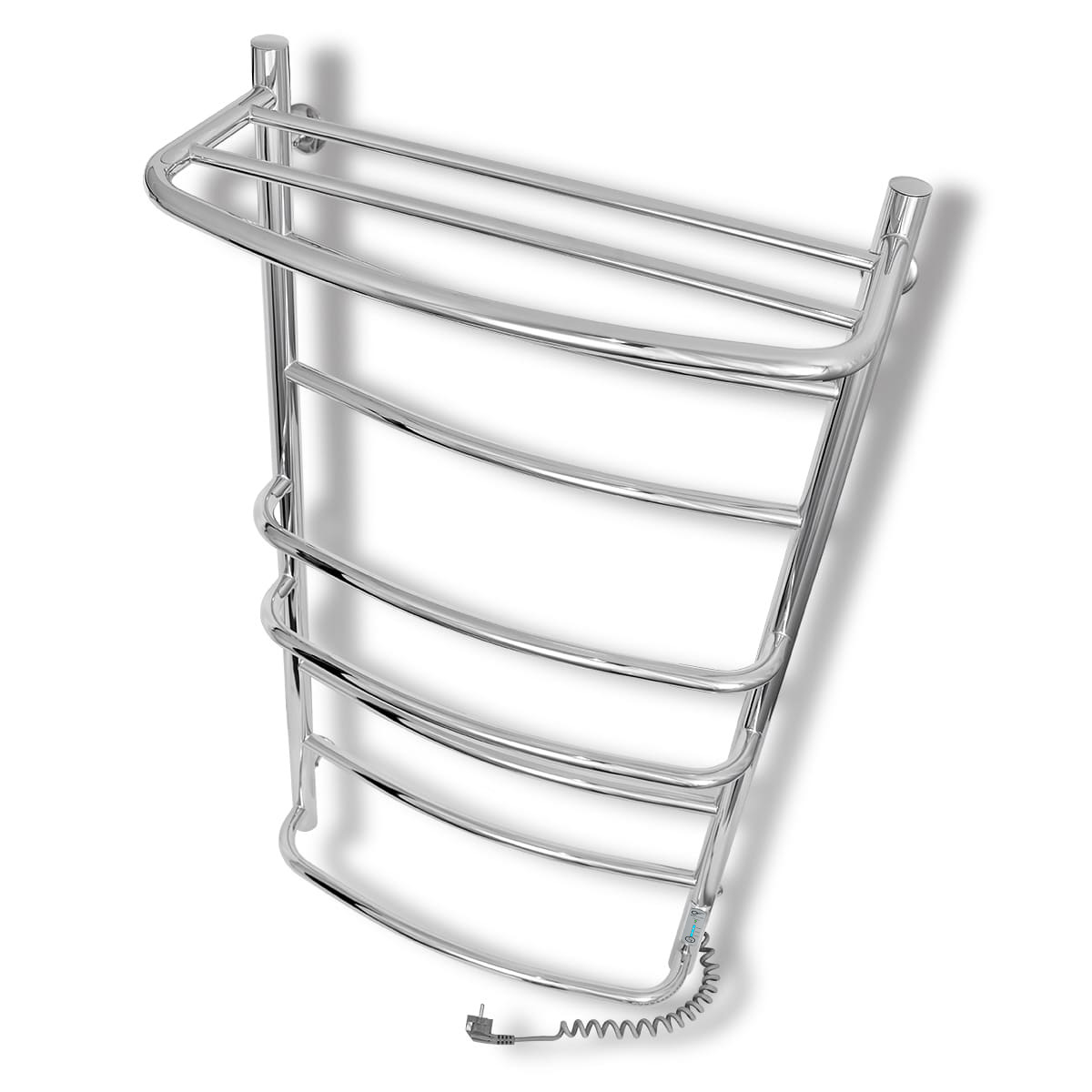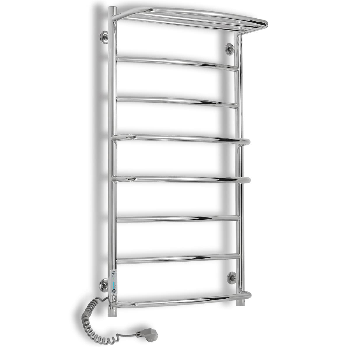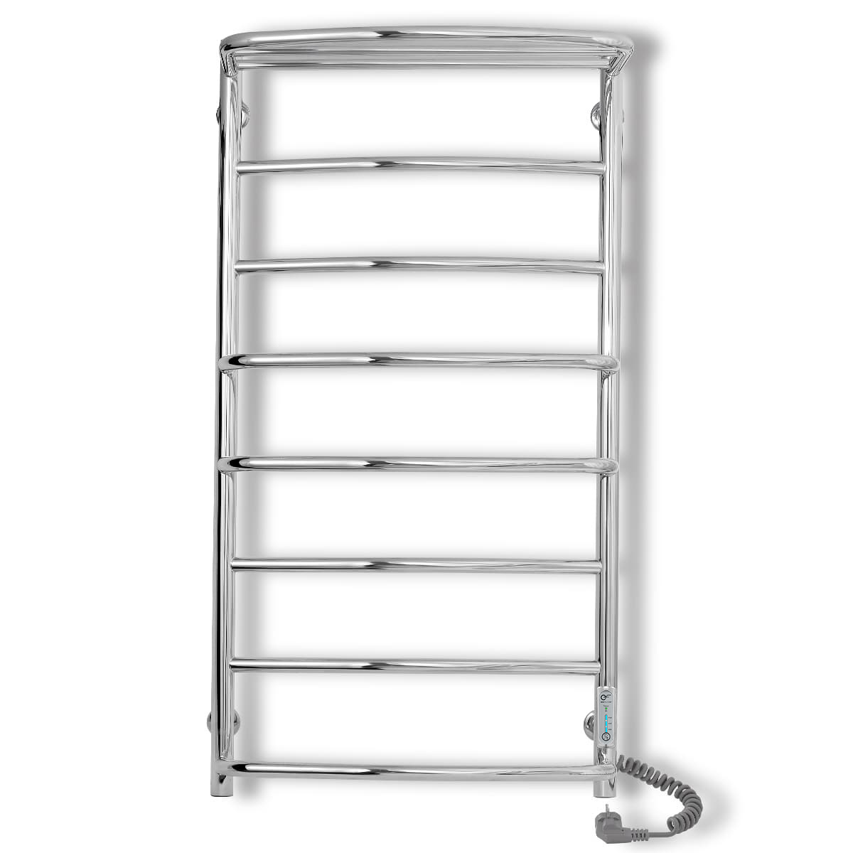 Електрична рушникосушка виконана з нержавіючої сталі та відполірована до дзеркального ефекту. Для зручного розміщення та просушування рушників, білизни або одягу верхня перекладина являє собою полку з рейлінгом. У стійку сушки для рушників вмонтований терморегулятор, який керується натисканням однієї кнопки “t°/T”. Терморегулятор запам'ятовує вибраний користувачем режим роботи і після вимкнення рушникосушки відновить вибрані параметри. Нагрів рушникосушки задається за трьохфазною шкалою і має три температурні режими: